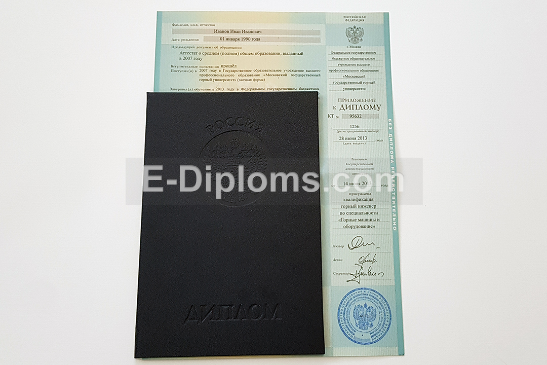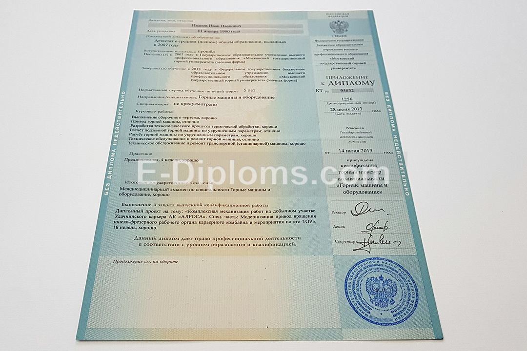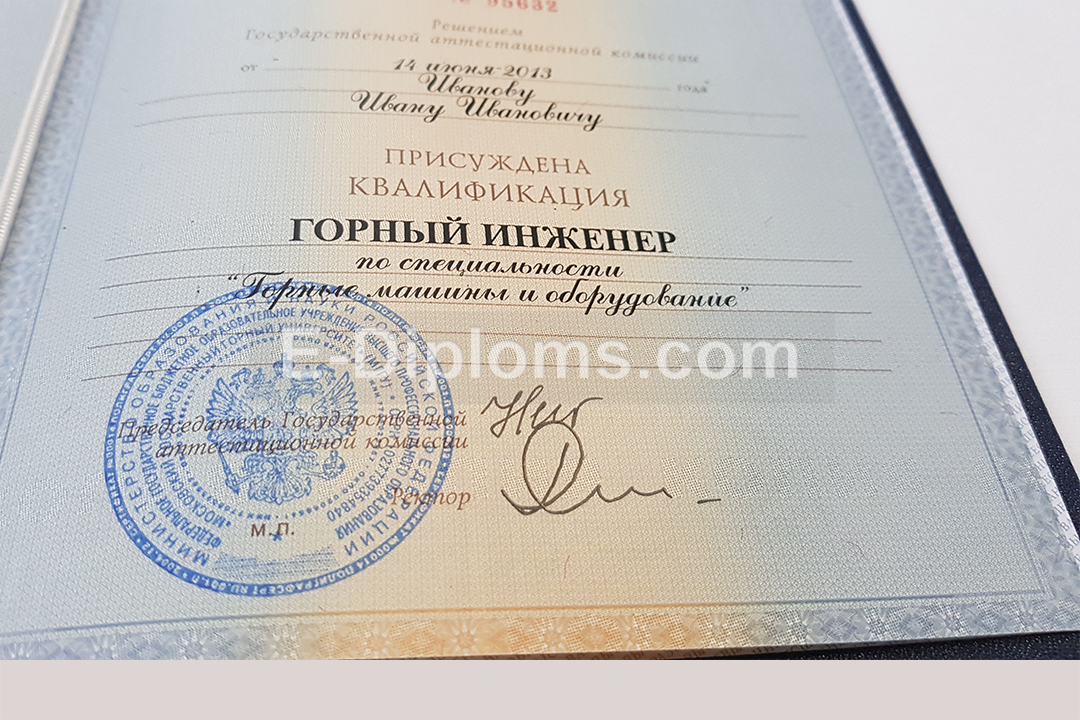 Диплом изготавливается на таких же бланках, которые выдавались выпускникам ВУЗов России в 2012, 2013 годах. Учебная программа, курсовые, ВКР соответствуют выбранному направлению подготовки и выбранному университету; гербовая печать и подписи, как в оригинале.